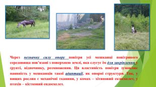 Через незначну силу опору повітря усі мешканці повітряного середовища пов’язані з поверхнею землі, яка слугує їм для закріплення у ґрунті, відпочинку, розмноження. Ця властивість повітря зумовлює наявність у мешканців такої адаптації, як опорні структури. Так, у вищих рослин є механічні тканини, у комах – хітиновий екзоскелет, у птахів – кістковий ендоскелет.