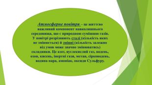 Атмосферне повітря – це життєво важливий компонент навколишнього середовища, що є природною сумішшю газів. У повітрі розрізняють сталі (кількість яких не змінюється) й змінні (кількість залежно від умов може значно змінюватись) складники. Це азот, вуглекислий газ, водень, озон, кисень, інертні гази, метан, сірководень, водяна пара, амоніак, оксиди Сульфуру.