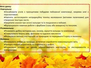 Тема уроку: "Чарівна осіння алея: малюємо пейзаж з використанням нетрадиційної техніки"