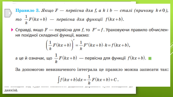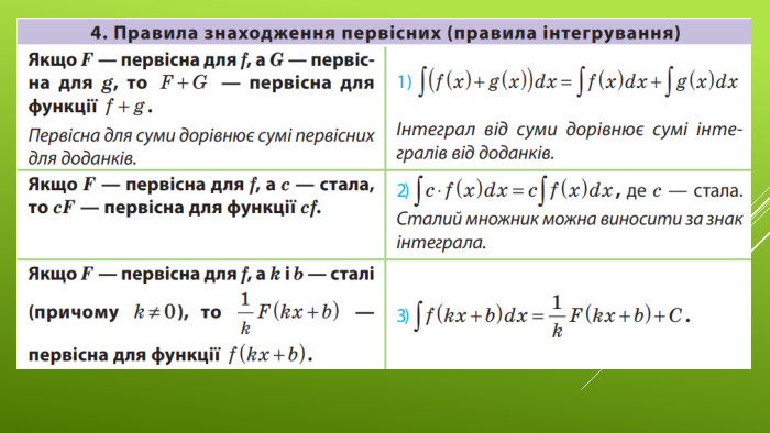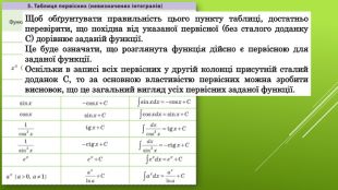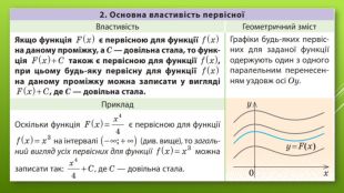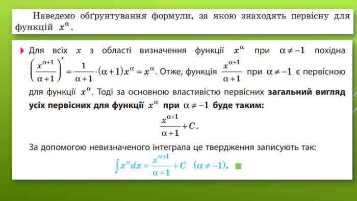Щоб обґрунтувати правильність цього пункту таблиці, достатньо перевірити, що похідна від указаної первісної (без сталого доданку С) дорівнює заданій функції. Це буде означати, що розглянута функція дійсно є первісною для заданої функції. Оскільки в записі всіх первісних у другій колонці присутній сталий доданок С, то за основною властивістю первісних можна зробити висновок, що це загальний вигляд усіх первісних заданої функції.