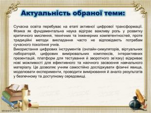 Актуальність обраної теми: Сучасна освіта перебуває на етапі активної цифрової трансформації. Фізика як фундаментальна наука відіграє важливу роль у розвитку критичного мислення, технічних та інженерних компетентностей, проте традиційні методи викладання часто не відповідають потребам сучасного покоління учнів. Використання цифрових інструментів (онлайн-симуляторів, віртуальних лабораторій, цифрових вимірювальних комплексів, інтерактивних презентацій, платформ для тестування й зворотного зв’язку) відкриває нові можливості для ефективного та наочного засвоєння навчального матеріалу. Це дозволяє учням самостійно досліджувати фізичні явища, моделювати експерименти, проводити вимірювання й аналіз результатів у безпечному та доступному середовищі.