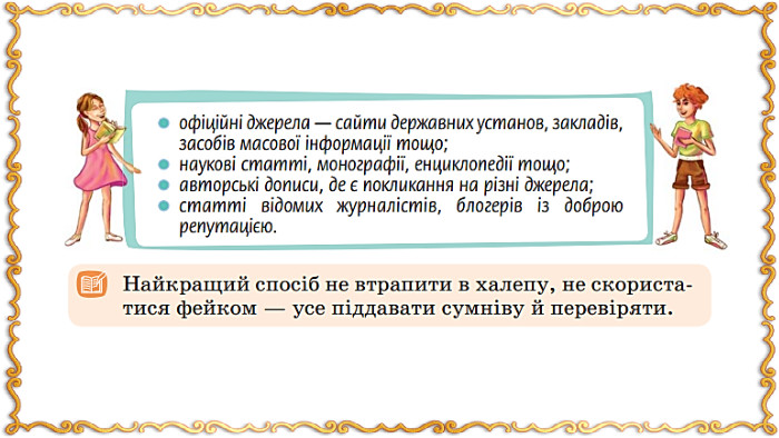 Ми вивчили у 5 класі: Що таке інформація. Види інформації. Джерела інформації (добір і пошук інформації; надійність джерел інформації). Факти, судження. Фейки.