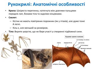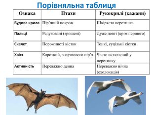 Практична робота №11 «Виявлення та порівняння пристосувань птахів та рукокрилих до польоту». Ознайомлення з морфологічними та анатомічними пристосуваннями птахів і рукокрилих до польоту, порівняти будову їхніх крил, скелета, а також у розвитку вміння аналізувати зв'язок між будовою тіла та способом життя (польотом) у різних груп (Птахи, Ссавці).