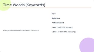 When you see these words, use Present Continuous! Now Right now At the moment Look! (Look! It is raining.) Listen! (Listen! She is singing.)Time Words (Keywords)