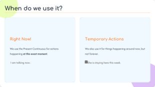 Right Now!We use the Present Continuous for actions happening at this exact moment. I am talking now. Temporary Actions. We also use it for things happening around now, but not forever. She is staying here this week. When do we use it?