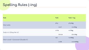 {FD48 F6 AA-B2 E8-4748-A186-9 F643 E42982 F}Rule. Verb. Verb + ing. Most verbsplay readplaying reading. Ends in 'e' (Drop the 'e')write dancewriting dancing. Short vowel + Consonant (Double it!)run swimrunning swimming. Spelling Rules (-ing)