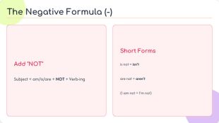 Add "NOT"Subject + am/is/are + NOT + Verb-ing. Short Formsis not = isn'tare not = aren't(I am not = I'm not)The Negative Formula (-)
