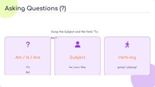 Swap the Subject and the Verb "To Be"!Am / Is / Are(To Be)Subjecthe / you / they. Verb-inggoing? / playing?Asking Questions (?)