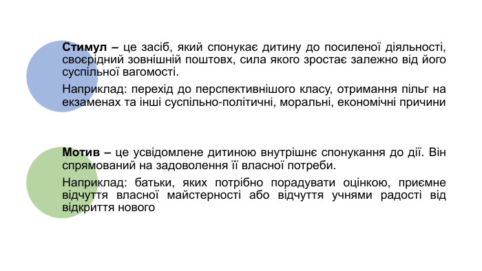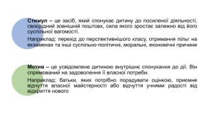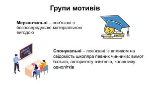 Групи мотивів. Соціальні – прагнення особистості шляхом навчання утвердити свій соціальний статус: у суспільстві в цілому, в певному соціальному колективі (сім’ї, класі)Професійно-ціннісні – відображають прагнення в майбутньому отримати професійну підготовку. Пізнавальні – виявляються у пробуджені пізнавальних інтересів і реалізуються шляхом отримання задоволення від самого процесу пізнання і його результатів