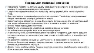 Поради для мотивації навчання. Побудувати теоретичну логіку предмету, зробивши учнів не просто виконавцями певних завдань, а своїми повноправними партнерами. Обирати та подавати навчальний матеріал у такому форматі, який точно зацікавить учнів. Використовувати різноманітні методи і форми навчання. Такий підхід завжди викликає інтерес та стимулює школярів до пізнання нового. Орієнтуватися на реалістичні вимоги. Вони мають бути високими, але не настільки, щоб учні не могли їх виконати, інакше вони просто втрачають інтерес до навчання. Вимоги треба підвищувати поступово. Забезпечити стабільний та оперативний зворотній зв’язок з учнями. Не забувати хвалити учнів, якщо вони на це заслуговують. Аналізувати учнівські роботи максимально конкретно та коректно. Діти мають розуміти, що, якщо є критика, то вона стосується саме певних недоліків роботи, а не особистості школяра. Не дозволяти жорсткої конкуренції між учнями та не порівнювати їх між собою. Конкуренція далеко не завжди стимулює до нових досягнень, навпаки – вона може призвести до негативних наслідків. Давати учням свободу вибору. Якщо це можливо, нехай вони самі обирають види робіт з кількох альтернативних варіантів.
