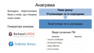 Пристрій введення даних, який використовують у звукозаписі. Результат сприйняття людиною повідомлень з навколишнього світу. Паличка для письма. Один з видів портативних комп’ютерів, який розрахований здебільшого на роботу з комп’ютерними мережами. Пристрій для друку даних на папері. Наука про інформацію та інформаційні процеси. Пристрій, що перетворює сигнал у форму, зручну для опрацювання. Об’єкт текстового документа, що має такі властивості: розміри сторінки, розміри полів, орієнтація сторінки, номер сторінки.{2 D5 ABB26-0587-4 C30-8999-92 F81 FD0307 C}МІКРОФОНІНФОРМАЦІЯСТИЛУСНЕТБУКПРИНТЕРІНФОРМАТИКАСЕНСОРСТОРІНКАЗнайдіть і запишіть у стовпчик слова за їх лексичним значенням. Підкресліть другу від початку літеру. Прочитайте отримане слово. Диктант з ключем