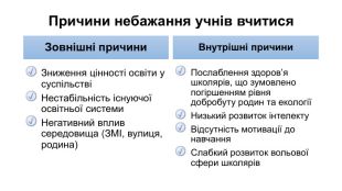 Причини небажання учнів вчитися. Зовнішні причини. Зниження цінності освіти у суспільствіНестабільність існуючої освітньої системи. Негативний вплив середовища (ЗМІ, вулиця, родина)Внутрішні причини. Послаблення здоров’я школярів, що зумовлено погіршенням рівня добробуту родин та екології Низький розвиток інтелекту Відсутність мотивації до навчання. Слабкий розвиток вольової сфери школярів
