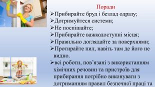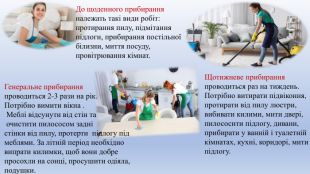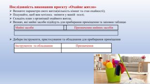 Презентація присвячена проєкту «Охайне житло», який виконують учні 6 класу з особливими освітніми потребами. У межах проєкту діти ознайомлюються з видами прибирання. У презентації описано, як виконується щоденне, щотижневе та генеральне прибирання. Учні дізнаються про основні етапи кожного виду прибирання, необхідні засоби та послідовність дій. Матеріал подано доступно й наочно, з урахуванням індивідуальних можливостей дітей з ООП.