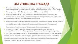 ЗАТУРЦІВСЬКА ГРОМАДАЗатурцівська сільська територіальна громада — територіальна громада в Україні, в Володимирському районі Волинської області. Адміністративний центр — село Затурці. Площа громади — 241,22 км², населення — 6027 мешканців (2018). Утворена 28 вересня 2017 року шляхом об'єднання Затурцівської, Зубильненської та Шельвівської сільських рад Локачинського району. 21 вересня 2018 року добровільно приєдналися Кисилинська та Холопичівська сільські ради. Утворена згідно розпорядження Кабінету Міністрів України від 12 червня 2020 р. № 708-р у складі Війницької, Затурцівської, Зубильненської, Кисилинської, Озютичівської, Холопичівської та Шельвівської сільських рад Локачинського району.19 липня 2020 року, в результаті адміністративно-територіальної реформи та ліквідації Локачинського району, громада увійла до складу Володимирського району. До складу громади входять 26 сіл: Великий Окорськ, Війниця, Вілька - Садівська, Войнин, Гранатів, Губин, Журавець, Запуст, Затурці, Зубильне, Квасовиця, Кисилин, Малий Окорськ, Маньків, Михайлівка, Мовчанів, Озютичі, Павловичі, Садівські Дубини,Семеринське, Сірнички, Твердині, Тумин, Холопичі, Шельвів та Юнівка.