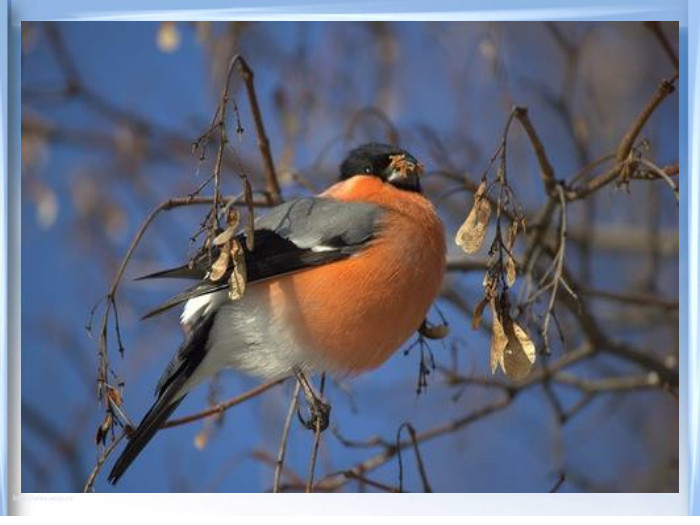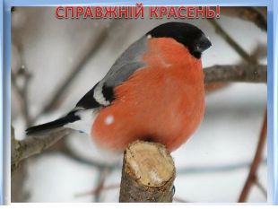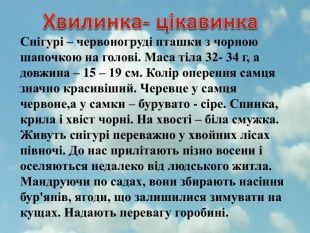 Хвилинка- цікавинка. Снігурі – червоногруді пташки з чорною шапочкою на голові. Маса тіла 32- 34 г, а довжина – 15 – 19 см. Колір оперення самця значно красивіший. Черевце у самця червоне,а у самки – бурувато - сіре. Спинка, крила і хвіст чорні. На хвості – біла смужка. Живуть снігурі переважно у хвойних лісах півночі. До нас прилітають пізно восени і оселяються недалеко від людського житла. Мандруючи по садах, вони збирають насіння бур'янів, ягоди, що залишилися зимувати на кущах. Надають перевагу горобині.