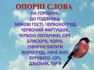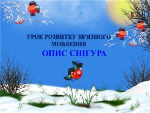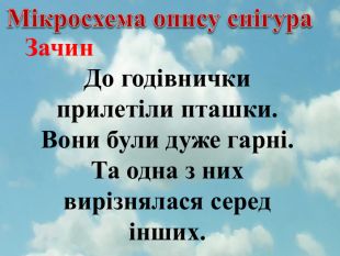 Мікросхема опису снігура. Зачин. До годівнички прилетіли пташки. Вони були дуже гарні. Та одна з них вирізнялася серед інших.