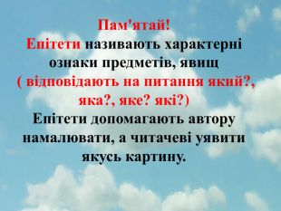 Пам'ятай!Епітети називають характерні ознаки предметів, явищ ( відповідають на питання який?, яка?, яке? які?)Епітети допомагають автору намалювати, а читачеві уявити якусь картину.