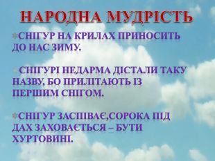 НАРОДНА МУДРІСТЬСнігур на крилах приносить до нас зиму. Снігурі недарма дістали таку назву, бо прилітають із першим снігом. Снігур заспіває,сорока під дах заховається – бути хуртовині.