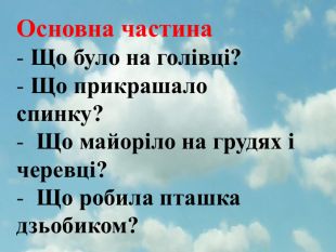 Основна частина Що було на голівці? Що прикрашало спинку? Що майоріло на грудях і черевці? Що робила пташка дзьобиком?
