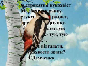 В гаю строкатий куцохвіст. Морозяного ранку. Вистукує, немов радист,Морозяну – морзянку.І лине, лине гаєм гук:“ Тук- тук, тук- тук, тук- тук”. Хто може відгадати,Як куцохвоста звати?Г. Демченкоstyle.font. Family