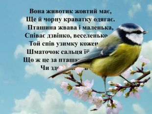 Вона животик жовтий має, Ще й чорну краватку одягає. Пташина жвава і маленька, Співає дзвінко, веселенько,— Той спів узимку кожен чує. Шматочок сальця їй смакує. Що ж це за пташка невеличка, Чи здогадались ви?