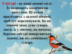 Снігурі - це наші зимові гості. Їх називають північними папугами. Ці птахи прилітають з далекої півночі, щоб тут перезимувати. Бо на півночі зима дуже сувора, люта. А у лютому, на початку березня снігурі повертаються додому, аж під самісіньку тундру.