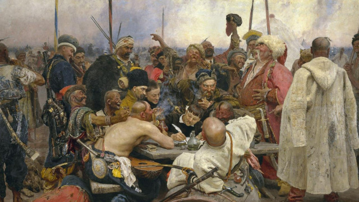 Ілля Рєпін. «Запорожці пишуть листа турецькому султанові»(1880 - 1891)Сюжетом цієї картини став відомий лист запорожців турецькому султанові, написаний як відповідь запорозьких козаків на вимогу османського султана Мегмеда IV. Консультантом художника був відомий історик українського козацтва Дмитро Яворницький, він же позував Рєпіну для створення образу писаря (в центрі картини),а за отамана Сірка художник обрав самого київського генерал-губернатора Михайла Драгомирова. Усміхнений козак у білій шапці - це журналіст і письменник Володимир Гіляровський.