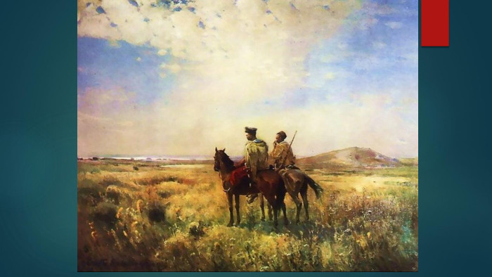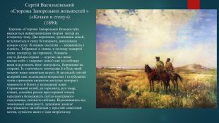 Сергій Васильківський«Сторожа Запорозьких вольностей »(«Козаки в степу») (1890) Картина «Сторожа Запорозьких Вольностей» вважається найвизначнішим твором митця на історичну тему. Два вершники, зупинивши коней, вслухаються в тишу безлюдного, випаленого сонцем степу. В міцних постатях — впевненість і гідність. Зображені зі спини, в легкому повороті вліво; попереду, на горизонті, блищить смуга Дніпра справа — курган; над ними високе небо з хмарами: невід'ємні від пейзажу вони підсилюють його значущість. Вершники на сторожі. Їх статичність тимчасова й в будь-який момент може змінитися на рух. В загальній світлій колірній гамі зеленкувато-вохристих і голубуватих тонів стриманим акцентом виступає контраст червоного й білого у козацькому одязі. Спрямований вглиб, до горизонту, рух хмар, плавні, спокійні ритми просторових планів передають безмежність світло-повітряного середовища, епічність пейзажу. Відмовившись від зовнішньої оповідності, художник досягає внутрішнього заглиблення у простий сюжетний мотив, сутністю якого є ідея патріотизму.