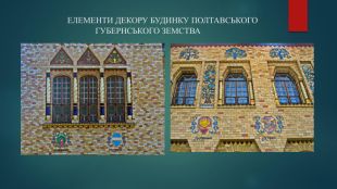 Будинок Полтавського губернського земства.(1903-1908)Будинок Полтавського губернського земства споруджено в 1903-1908 рр. за проектом архітектора В. Кричевського . В оздобленні брали участь художники С. Васильківський, М. Самокиш, М. Беркос, М. Уваров, учні Миргородської керамічної школи та опішнянські гончарі. Саме цей будинок можна вважати найвідомішою будівлею в стилі українського модерну. В його основі лежали форми української народної хатньої і церковної архітектури. Основними його елементами є використання синусоїдальних ліній, стилізованих квітів, язиків полум'я, хвилястих ліній, запозичених в природі.