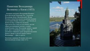 Памятник Володимиру Великому у Києві (1853) Авторами монумента Володимира Великого були архітектор Олександр Тон і скульптор Володимир Демут-Малиновський. Фігура Великого князя була відлита всесвітньо відомим скульптором Петром Клодтом і доставлена до Києва під його особистим наглядом Хреститель Русі стоїть на постаменті, що має обриси восьмигранної каплиці у псевдо візантійському стилі. Володимир тримає у правій руці хрест та князівську шапку в лівій. На постаменті зображені сцени хрещення населення Києва в Дніпрі та регалії ордена Святого Володимира — зірки та хрести. Пам'ятник заввишки 20 метрів, хоча сама бронзова фігура складає лише 4,5 м. .