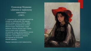 Олександр Мурашко«Дівчина в червоному капелюсі»(1903)У художника був надзвичайно точний зір, схожий на снайперський. Він швидко засвоїв манеру досить точного, майже академічного, відтворення на полотні обличчя моделі. Реалістично і точно виписане обличчя молодої пані і її рука, тоді як модна сукня з рукавами-ліхтариками подана організованим хаосом широких мазків. Широкими мазками передано і тло портрета, в котрому відтворений ще негнучкий, дівочий характер. Портрет написано в стилі імпресіонізму