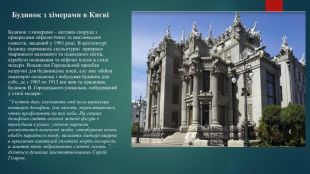 Будинок з хімерами в Києві Будинок з химерами – цегляна споруда з прикрасами міфологічних та мисливських сюжетів, зведений у 1901 році. В архітектурі будинку переважать скульптурні прикраси тваринного наземного та підводного світів, атрибути полювання та міфічні істоти в стилі модерн. Владислав Городецький придбав незручні для будівництва землі, але зміг обійти інженерні складнощі і побудував будинок для себе, де з 1903 по 1913 він жив та працював. Будинок В. Городецького унікальна, побудований у стилі модерн . “З кутків даху спускають свої вуса-щупальця потворні дельфіни, їхні хвости, переплітаючись, чітко профілюють на тлі неба. На спинах дельфінів сидять оголені жіночі фігури з тризубами в руках; уздовж карнизів розмістилися величезні жаби; стовбурами колон, обабіч парадного входу, вилазять бадьорі ящірки; в орнамент капітелей уплетені морди носорогів, а лиштви вікон зображають слонячі голови..”, - ділиться думками мистецтвознавець Сергій Гіляров.