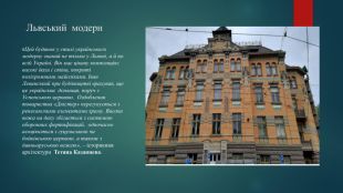Львський модерн«Цей будинок у стилі українського модерну знаний не тільки у Львові, а й по всій Україні. Він має цікаву композицію: високі дахи і стіни, покриті поліхромними майоліками. Іван Левинський при будівництві врахував, що це українська дільниця, поруч з Успенською церквою. Оздоблення товариства «Дністер» перегукується з ренесансними елементами храму. Висока вежа на даху збігається з системою оборонних фортифікацій, одночасно асоціюється з гуцульською чи бойківською церквою, а також з давньоруською вежею», – історикиня архітектури Тетяна Казанцева.