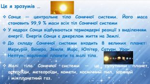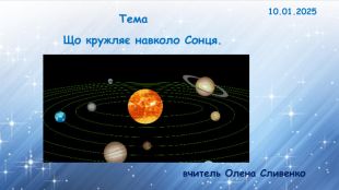 Презентація для супроводу уроку у 6 класі НУШ на тему " Що кружляє навколо Сонця " містить посилання на інтерактиві вправу для перевірки та закріплення знань. Матеріал буде корисний для онлайн уроку та як доповнення до розповіді вчителя на уроці та зацікавить дітей при вивченні розділу «Пізнаємо Сонячну систему».