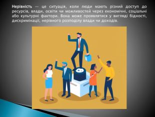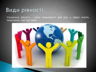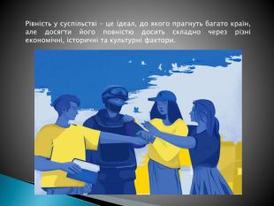Рівність у суспільстві означає, що всі люди мають рівні права, можливості та доступ до ресурсів, незалежно від їхнього походження, статі, раси, соціального статусу чи інших характеристик. Це поняття охоплює рівність перед законом, рівність можливостей у навчанні, працевлаштуванні та інших сферах життя.