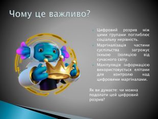 Цифровий розрив між цими групами поглиблює соціальну нерівність. Маргіналізація частини суспільства загрожує їхньою ізоляцією від сучасного світу. Маніпуляція інформацією використовується елітами для контролю над цифровими маргіналами. Чому це важливо?Як ви думаєте: чи можна подолати цей цифровий розрив?