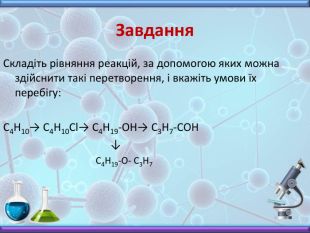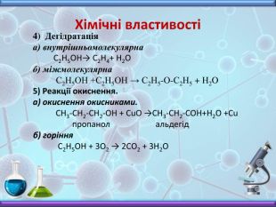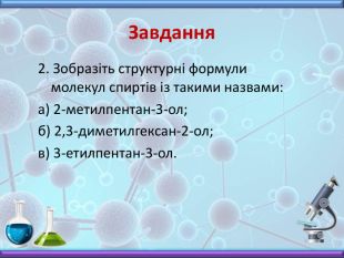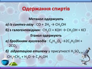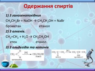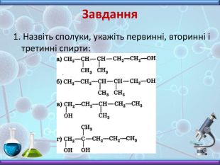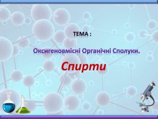 Презентація з хімії до вивчення теми "Спирти" у 10 класі. Містить інформацію про будову, номенклатуру, фізичні властивості, хімічні взаємодії та застосування насичених одноатомних спиртів. Включає завдання до цієї теми, необхідні для закріплення матеріалу.