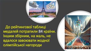 Презентація призначена для позакласної роботи на уроках фізичної культури з теми «Світові досягнення спортсменів України». Даний матеріал містить відомості про результати участі збірної України в літній олімпіаді -2024 в Парижі: види спортивних змагань та кількість перемог.