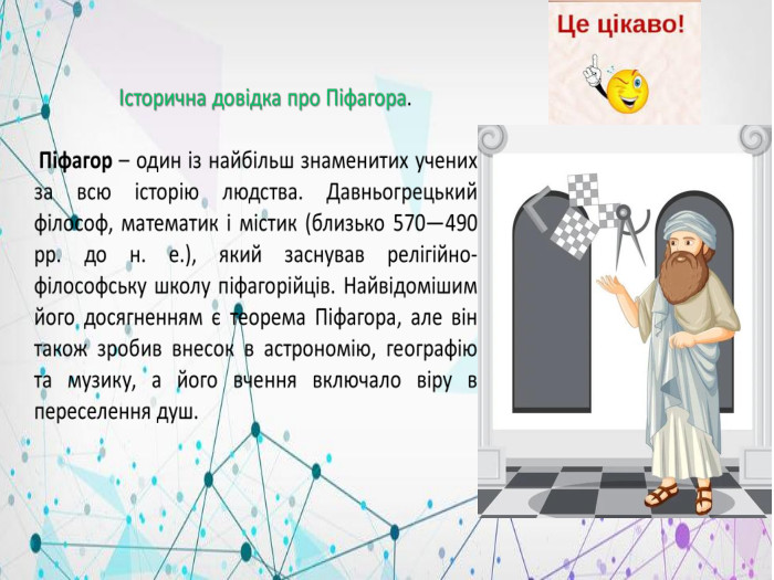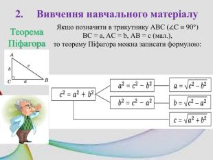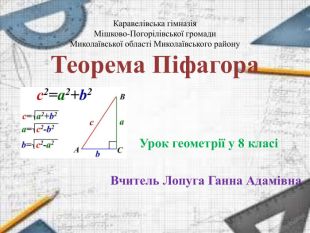 Тема. Теорема Піфагора. Мета: ознайомитися зі змістом і доведенням теореми Піфагора та наслідків з неї; показати застосування теореми при розв'язуванні, задач; формувати вміння правильно і чітко висловлювати власні думки, формулювати математичні твердження; виховувати дисциплінованість, позитивне ставлення до знань. Очікувані результати: учні знають доведення теореми Піфагора, вміють застосовувати її для розв’язування задач на знаходження сторін прямокутного трикутника. Повідомлення теми уроку та мотивація навчально-пізнавальної діяльності учнів