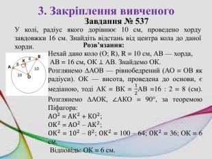 3. Закріплення вивченого. Завдання № 537 У колі, радіус якого дорівнює 10 см, проведено хорду завдовжки 16 см. Знайдіть відстань від центра кола до даної хорди. Розв’язання: Нехай дано коло (О; R), R = 10 см, АВ — хорда, АВ = 16 см, ОК ⊥ АВ. Знайдемо ОК. Розглянемо ∆АОВ — рівнобедрений (АО = ОВ як радіуси). ОК — висота, проведена до основи, є медіаною, тоді АК = ВК = 12 АВ =16 : 2 = 8 (см). Розглянемо ∆АОК, ∠АКО = 90°, за теоремою Піфагора: AO2 = AK2 + KO2; OK2 = AO2 – AK2; OK2 = 102 – 82; OK2 = 100 – 64; OK2 = 36; ОК = 6 см. Відповідь: ОК = 6 см.
