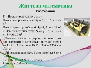 Життєва математика. Розв’язання. Площа стелі кожного залу. Площа квадратної стелі: S1 = 3,5 ∙ 3,5 =12,25 м2 Площа прямокутної стелі: S2= 4, 5 ∙ 4 = 18 м22) Загальна площа стелі: S = S1 + S2 = 12,25 + 18 = 30,25 м23)Загальна кількість фарби, яка необхідна для фарбування всієї стелі. Витрати фарби на 1 м² - 240 г: m = 30,25 ∙ 240 = 7260 г = 7,26 кг4)Мінімальна кількість банок фарби(2,5 кг в банці): n = 7,26 : 2,5 =2, 904 3 банки. Відповідь: 3 банки.
