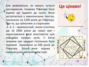 Але виявляється, як кажуть сучасні дослідження, теорема Піфагора була відома ще задовго до нього. Вона зустрічається у вавилонських текстах, написаних за 1200 років до Піфагора. Про те, що трикутник зі сторонами 3, 4, 5 - прямокутний, знали єгиптяни ще за 2000 років до нашої ери і користувалися цією властивістю для побудови прямих кутів. У Китаї теорема про квадрат гіпотенузи була відомою принаймні за 500 років до Піфагора, була вона відома і найдавнішим математикам Індії.