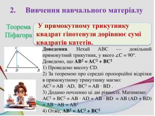 2. Вивчення навчального матеріалу. Теорема Піфагора У прямокутному трикутнику квадрат гіпотенузи дорівнює сумі квадратів катетів. Доведення. Нехай АВС — довільний прямокутний трикутник, у якого ∠C = 90°. Доведемо, що AB2 = AC2 + BC21) Проведемо висоту CD.2) За теоремою про середні пропорційні відрізки в прямокутному трикутнику маємо: AC2 = AB ∙ AD, BC2 = AB ∙ BD .3) Додамо почленно ці дві рівності. Матимемо: AC2 + BC2 = AB ∙ AD + AB ∙ BD = AB (AD + BD) = AB ∙ AB = AB2 4) Отже, AB2 = AC2 + BC2.
