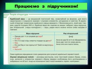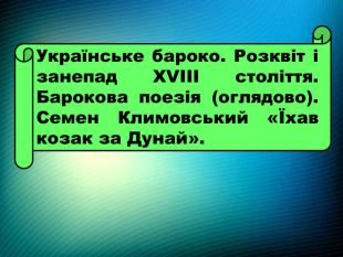 До речі…Література бароко поєднувала зовсім різне. У ній уживалися високе й низьке, релігійне й світське, серйозне й комічне. У текстах часто траплялися контрасти: життя — смерть, світло — темрява, земне — небесне. Українське бароко було найдовшим у Європі. У Європі бароко тривало приблизно століття, а в Україні — майже два. Воно почалося в другій половині XVI ст. і тягнулося аж до початку XVIII ст., поєднавшись із козацькою культурою. Найпоширенішим жанром була поезія. Особливо популярними стали вірші-емблеми, акровірші, вірші-лабіринти, де форма була не менш важливою, ніж зміст. Автори змагалися у винахідливості.