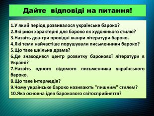 Дайте відповіді на питання!1. У який період розвивалося українське бароко?2. Які риси характерні для бароко як художнього стилю?3. Назвіть два-три провідні жанри літератури бароко.4. Які теми найчастіше порушували письменники бароко?5. Що таке шкільна драма?6. Де знаходився центр розвитку барокової літератури в Україні?7. Назвіть одного відомого письменника українського бароко.8. Що таке інтермедія?9. Чому українське бароко називають "пишним" стилем?10. Яка основна ідея барокового світосприйняття?