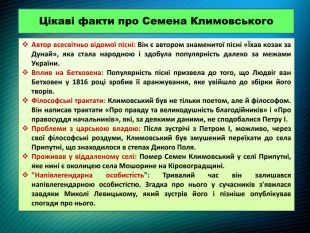 Цікаві факти про Семена Климовського. Автор всесвітньо відомої пісні: Він є автором знаменитої пісні «Їхав козак за Дунай», яка стала народною і здобула популярність далеко за межами України. Вплив на Бетховена: Популярність пісні призвела до того, що Людвіг ван Бетховен у 1816 році зробив її аранжування, яке увійшло до збірки його творів. Філософські трактати: Климовський був не тільки поетом, але й філософом. Він написав трактати «Про правду та великодушність благодійників» і «Про правосуддя начальників», які, за деякими даними, не сподобалися Петру І. Проблеми з царською владою: Після зустрічі з Петром І, можливо, через свої філософські роздуми, Климовський був змушений переїхати до села Припутні, що знаходилося в степах Дикого Поля. Проживав у віддаленому селі: Помер Семен Климовський у селі Припутні, яке нині є околицею села Мошорине на Кіровоградщині. "Напівлегендарна особистість": Тривалий час він залишався напівлегендарною особистістю. Згадка про нього у сучасників з'явилася завдяки Миколі Левицькому, який зустрів його і пізніше опублікував спогади про нього.