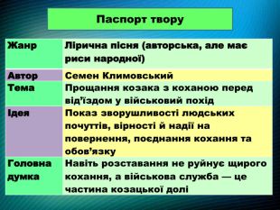 Паспорт твору{5 C22544 A-7 EE6-4342-B048-85 BDC9 FD1 C3 A}Жанр. Лірична пісня (авторська, але має риси народної)Автор. Семен Климовський. Тема. Прощання козака з коханою перед від’їздом у військовий похідІдея. Показ зворушливості людських почуттів, вірності й надії на повернення, поєднання кохання та обов’язку. Головна думка. Навіть розставання не руйнує щирого кохання, а військова служба — це частина козацької долі