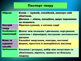 Паспорт твору{5 C22544 A-7 EE6-4342-B048-85 BDC9 FD1 C3 A}Образи. Козак — мужній, спокійний, виконує свій обов’язок. Дівчина — ніжна, емоційна, щиро переживає за коханого. Настрій твору. Лірично-сумний, з нотами надіїОсобливості композиціїДіалог між козака́м і дівчиною; чергування запитань і відповідей; поступове заспокоєння дівчини. Мова та художні засоби. Емоційні звертання, повтори, пестливі форми, простота й мелодійність вислову. Проблематика. Кохання і розлука, вибір між почуттями та обов’язком, вірність, тривога за близьку людину