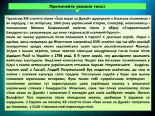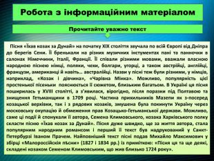 Пісня «Їхав козак за Дунай» на початку XIX століття звучала по всій Європі від Дніпра до берегів Сени. Її бренькали на різних музичних інстументах пані та панночки в салонах Німеччини, Італії, Франції. Її співали різними мовами, вважали власною народною піснею німці, поляки, чехи, болгари, угорці, а також австрійці, англійці, французи, американці й навіть… австралійці. Назви у пісні теж були різними, у німців, наприклад, «Козак і дівчина», «Чарівна Мінка». Можливо, популярність цієї простенької пісеньки пояснюється її сюжетом, близьким багатьом. В Україні ця пісня поширилась у XVIII столітті, а з’явилася, вірогідно, після поразки під Полтавою та знищення Гетьманщини в 1709 році. Частина прихильників Мазепи як з-посеред козацької верхівки, так і з рядових козаків, змушена була покинути Україну через московську окупацію й обмеження прав Козацько-Гетьманської держави. Можливо, саме ці події й спонукали її автора, Семена Климовського, козака Харківського полку скласти пісню «Їхав козак за Дунай». Пісня дуже швидко, ще за життя автора, стала популярним народним романсом і перший її текст був надрукований у Санкт-Петербурзі Іваном Прачем. Найповніший текст пісні подав Михайло Максимович у збірці «Малороссійскія пѣсни» (1827 і 1834 рр.) із приміткою: «Пісня ця та ще деякі, складені козаком Семеном Климовським, що жив близько 1724 року». Робота з інформаційним матеріалом. Прочитайте уважно текст