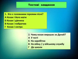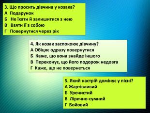 3. Що просить дівчина у козака?А Подарунок. Б Не їхати й залишитися з нею. В Взяти її з собою. Г Повернутися через рік4. Як козак заспокоює дівчину?А Обіцяє одразу повернутися. Б Каже, що вона знайде іншого. В Переконує, що його подорож недовга. Г Каже, що не повернеться5. Який настрій домінує у пісні?А Жартівливий. Б Урочистий. В Лірично-сумний. Г Бойовий